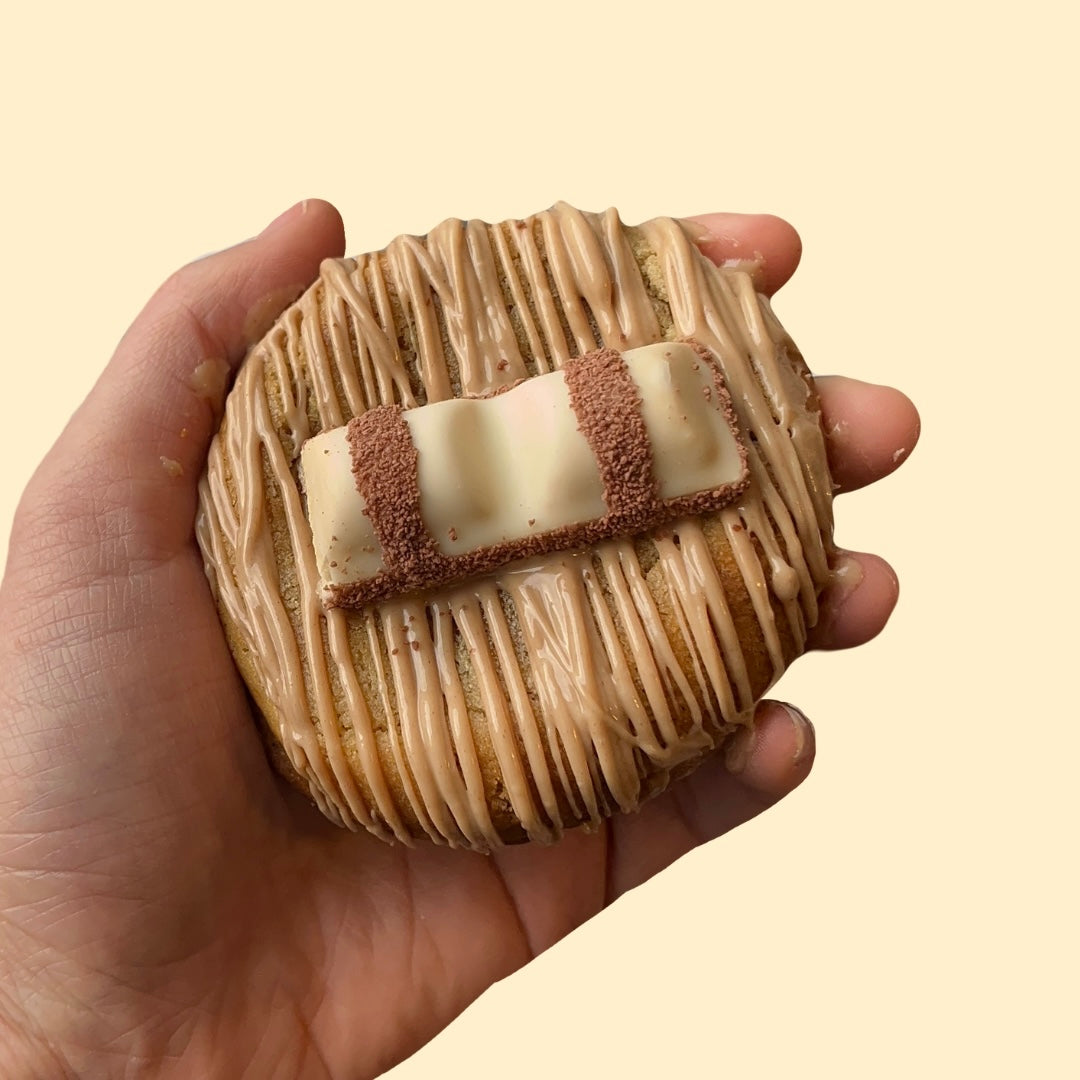 Beurre demi-sel, sucre de canne, vergeoise blonde, œufs, farine, bicarbonate, arôme naturel de vanille, et toppings selon le cookie choisi.